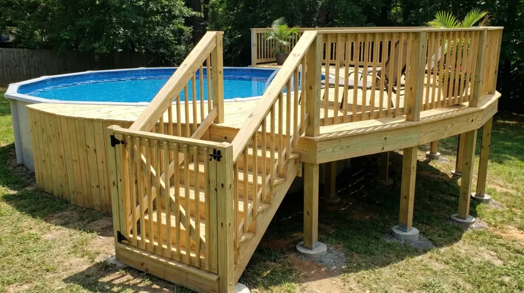 A partial deck gives you seating and entry without the cost of wrapping the whole pool. You can build a platform for the ladder, a small lounge area, or an L-shaped cutout to save materials.