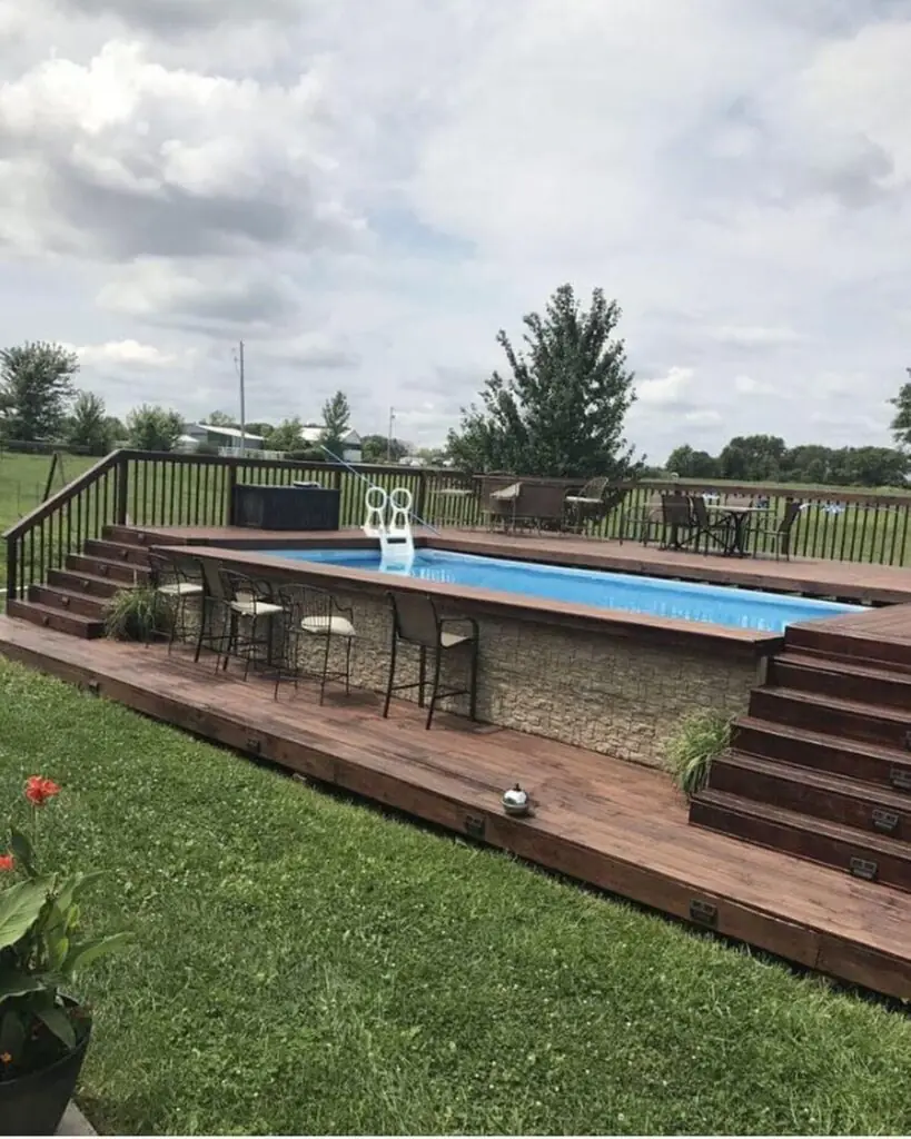 Turn your above-ground pool into an entertainment hub with a surrounding deck and integrated seating. Add a built-in bar or counter so you can serve drinks and snacks without leaving the pool area.