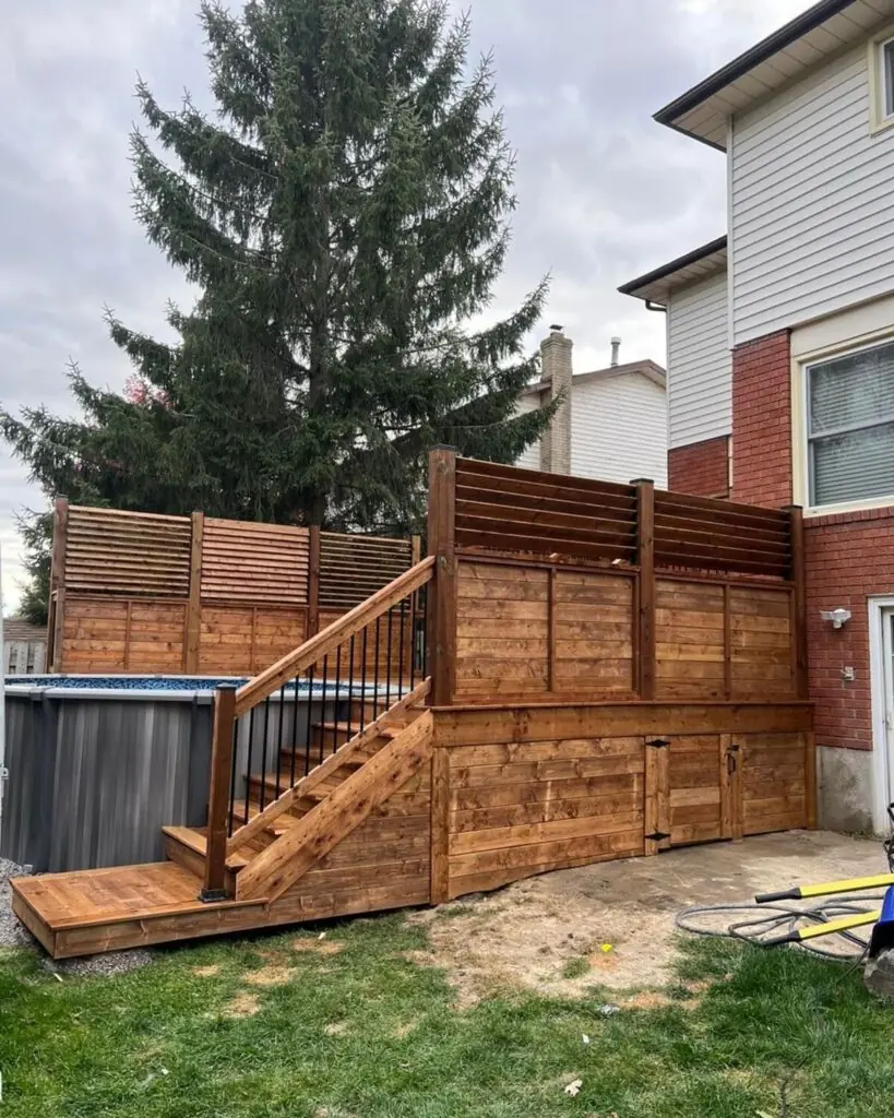 Measure pool rim height before designing a deck so the deck surface aligns with the pool top for safe, easy access. For above-ground pools, build a platform with a 2–3 foot wide perimeter or a full wraparound deck; this creates seating, storage, and a solid transition from yard to water.