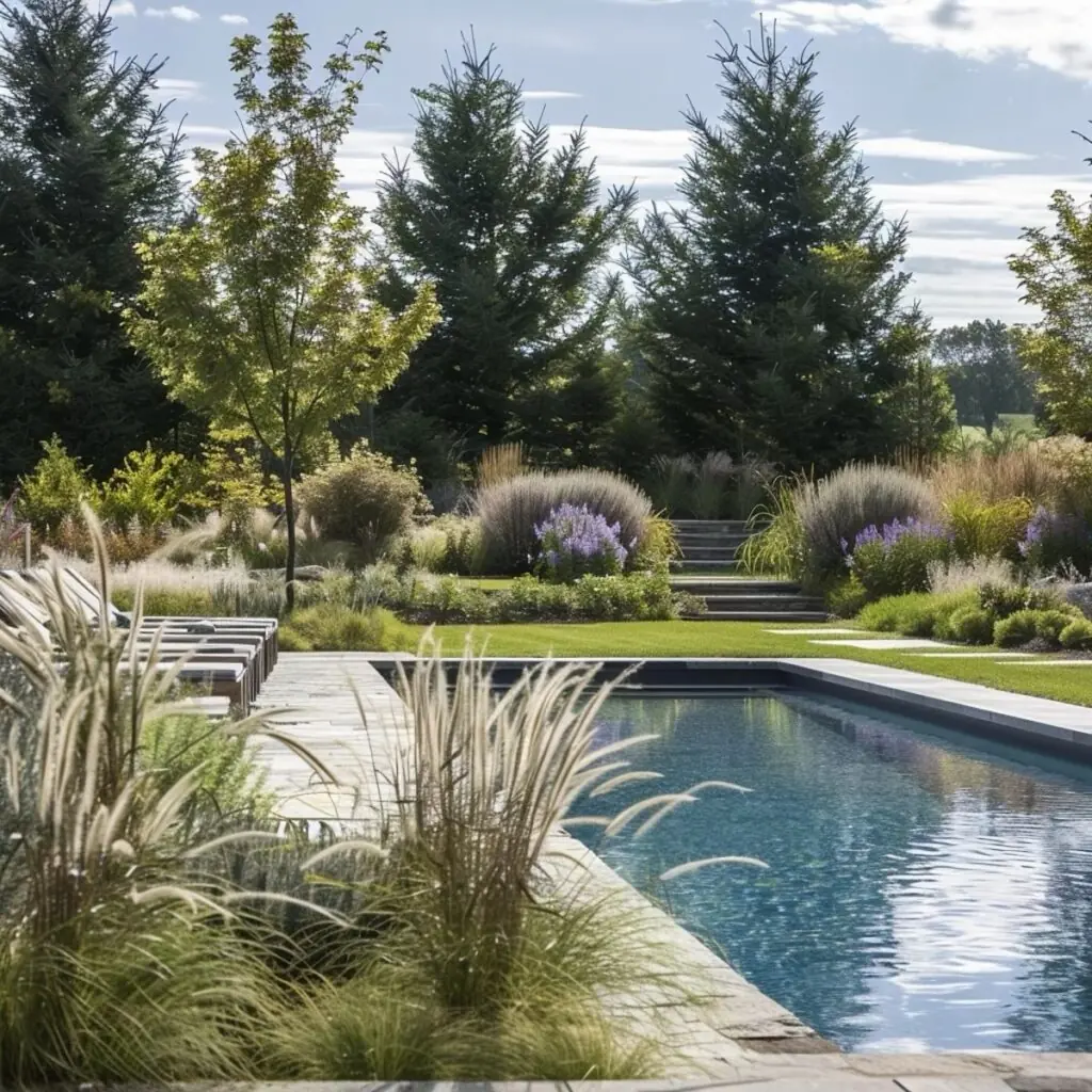 Integrate shade trees selectively: small-maturing trees like Japanese maple or crape myrtle provide canopy without heavy litter. Place trees where their dripline won’t drop directly into the pool and use root barriers on species prone to aggressive roots. Combine shrubs and taller grasses for layered privacy that still allows airflow.