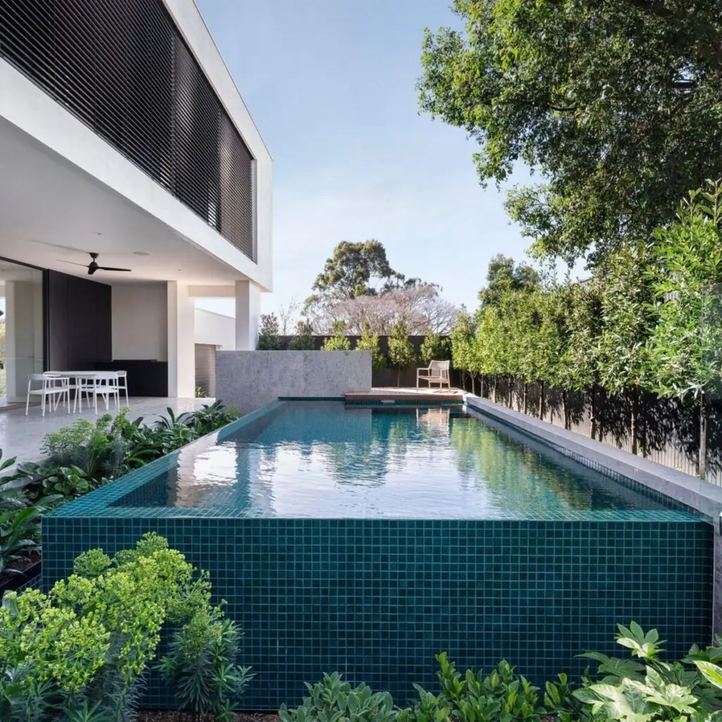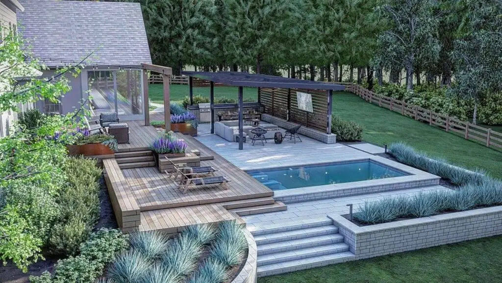 Scale plantings and furniture to surrounding elements so nothing looks out of place. Small yards benefit from low, neat shrubs; larger yards can handle taller screens or layered plantings to balance the pool.