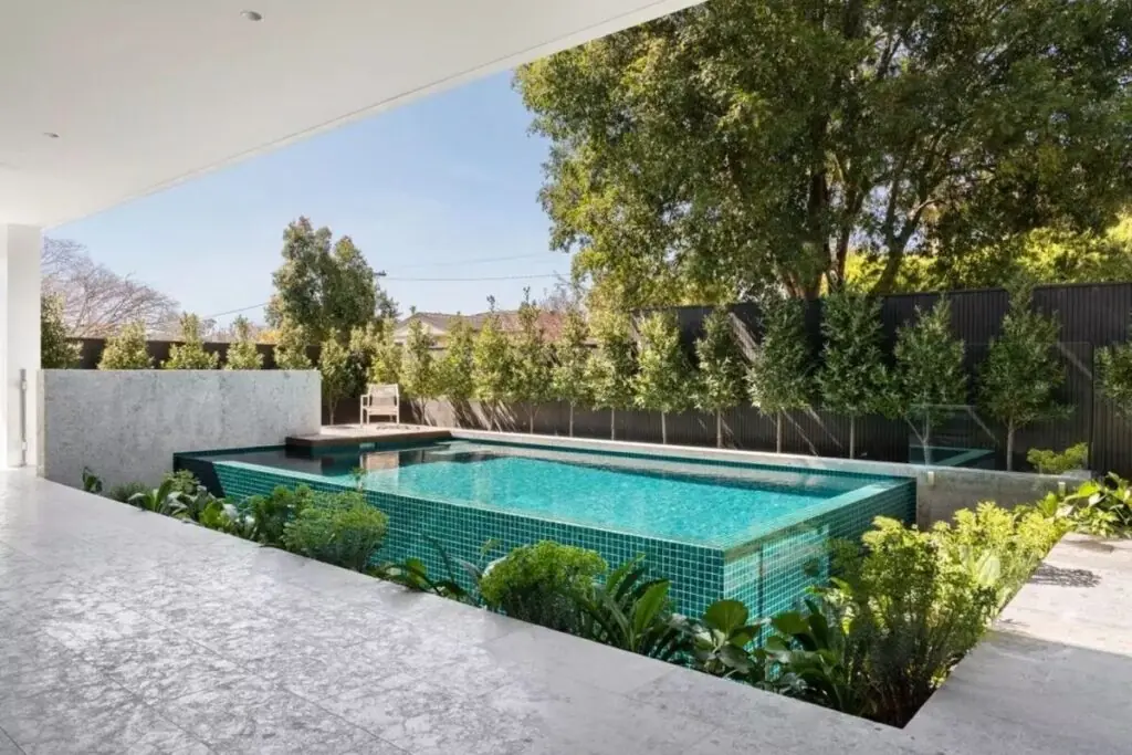 Add a short deck or step area that matches patio finishes to improve access and seating. Use planters and low walls to soften the transition and define the pool zone.